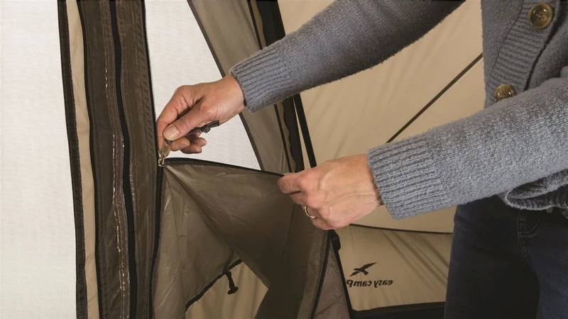 Met z’n allen in een warme tent vraagt natuurlijk om de nodige ventilatie. Wel zo frisjes! De goed verdeelde, lage ventilatieopeningen en het ventilatiepaneel in het dak zorgen voor een goede luchttoevoer. Door de gaasvensters rondom de voordeur én in de gordijnen onder de dakranden kan de luchtstroom gemakkelijk worden aangepast. Aan ventilatiemogelijkheden geen gebrek. Lucht dat even op!